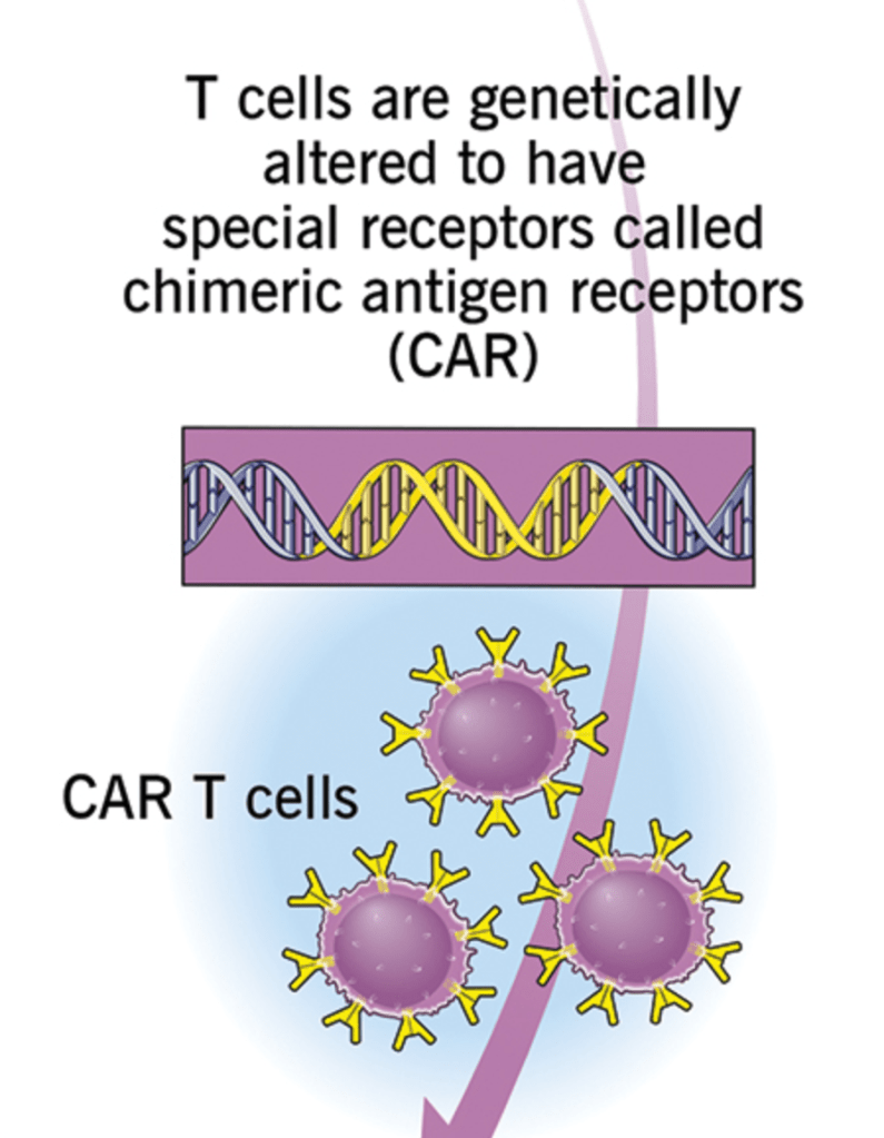 T cell therapy, if you are unfamiliar, is an amazing process in which a person’s own immune system (specifically their T cell units) are modified in a laboratory setting to fight off cancer. In other words, T cell therapy is essentially programming a person’s body to do the cancer fighting themselves. In looking up T cell therapy with regards to brain tumors, I came across CAR T-cell therapy which specifically has two types– axicabtagene ciloleucel and tisagenlecleucel. Despite their intimidating names, I came to find that the process of CAR T-cell therapy can be explained quite simply.
